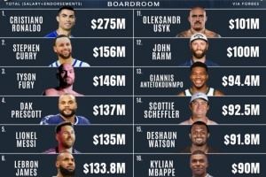 世界收入最高运动员:C罗2.75亿断档第1&库里1.56亿第2 詹姆斯第6